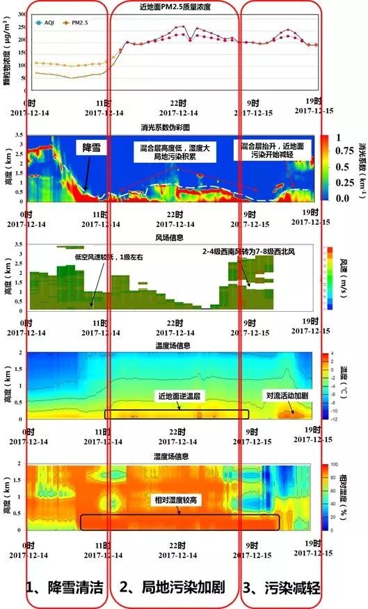 降雪清洁:12月14日凌晨,气溶胶激光雷达监测到高空云的演变过程,在近地面形成降雪,降雪通过湿沉降对空气污染物起到清除和冲刷,同时段近地面颗粒物浓度较低;