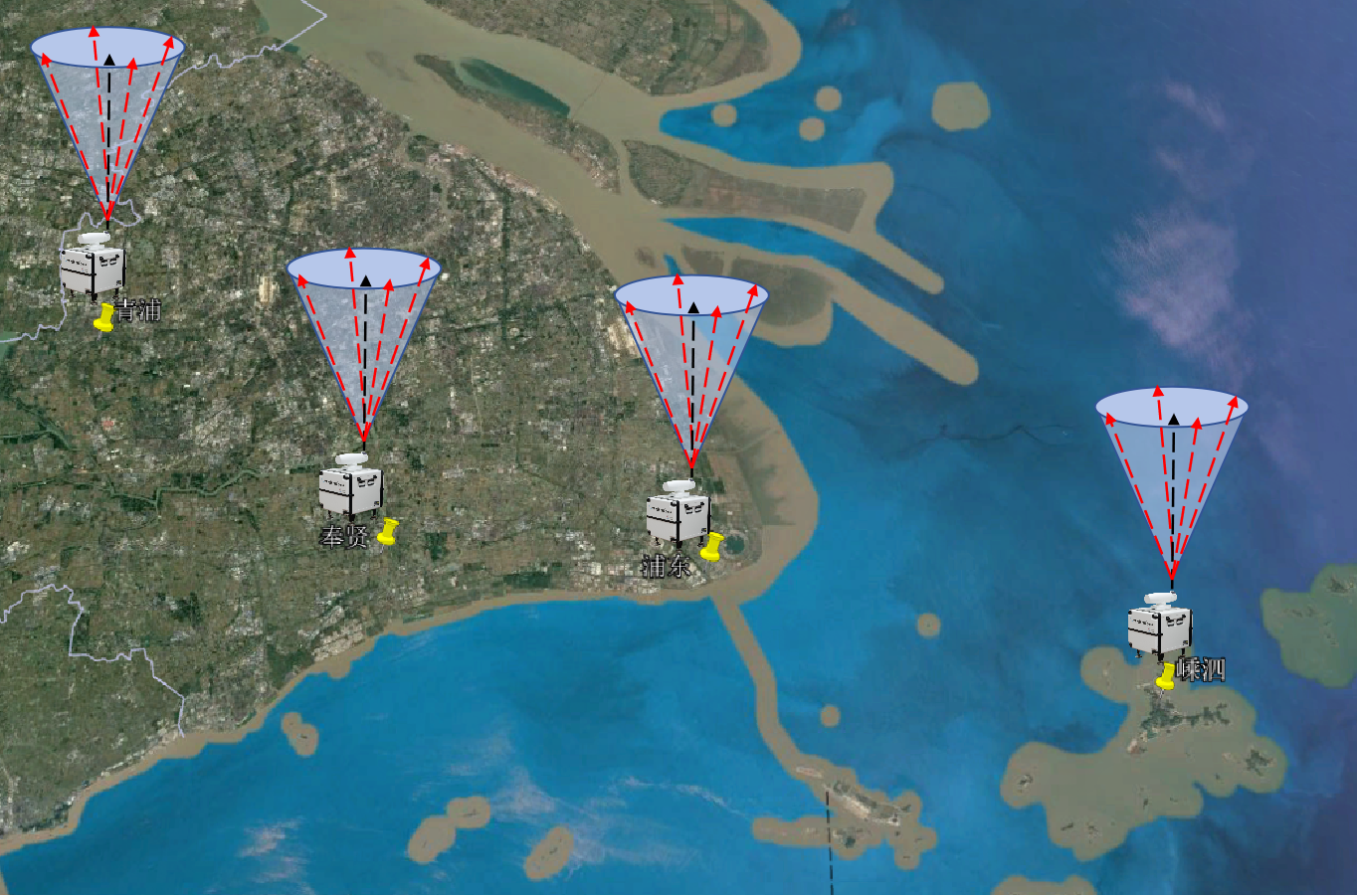 图2:分别布设在嵊泗、青浦、奉贤和浦东新区站点的测风雷达示意图