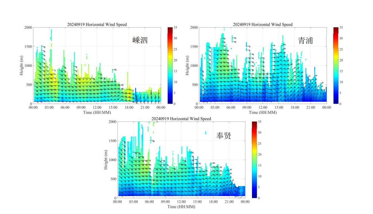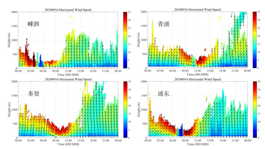 除此之外,设备在双台影响期间探测到了多个站点低空大风数据,布设在嵊泗、青浦、奉贤和浦东的测风激光雷达分别在“贝碧嘉”登陆期间观测到10分钟平均风力超12级的大风现象,当在台风眼墙经过时,200~300m高度层瞬时风力达13~14级。其中嵊泗站观测到的最大风速为48.1m/s,青浦、奉贤和浦东站的极值大风分别为39.1m/s、39.6m/s和43m/s。相比之下“普拉桑”登陆期间近地面风速虽然不算太大,但在300~1000m高空依然存在16~20m/s的大风区。